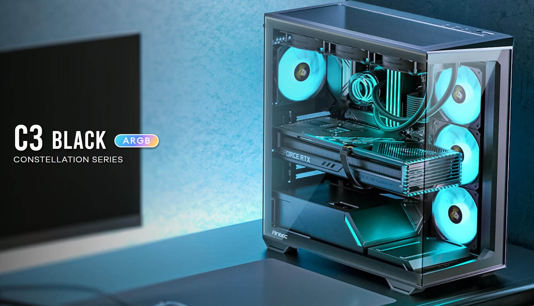 Antec C3 ARGB Black ATX, 270 Degrees Full View, 4x ARGB PWM Fans with control, 36CM top, 24cm Front. Cable Management, GPU 41.5 CM. Ultra Gaming Case