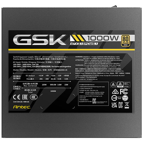 Antec GSK1000 AU, ATX 12V 3.1, 1000W, Full-Modular, 80 Plus Gold, 120mm FDB fan, 100–240V, OCP/OVP/UVP/SCP/OPP/OTP/SIP/NLO protection, 10yr wty