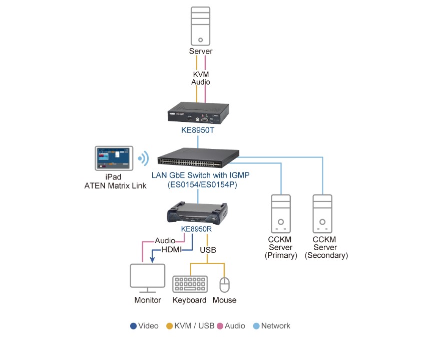 Implementing the KVM over IP Matrix Manager (CCKM) with KE8950, IT administrators receive advanced features functioning as auto detection of all KE Series Extenders* on the same subnet for the sake of fast installation or configuration, username/password authentication and authorization, and the ability to define different types of connections that can be switched and shared. Security features also provide extra protection, supporting AES encryption for secured data transmissions, while RADIUS, LDAP, AD or remote user authentication provides an added layer of connection security; moreover, with an OSD, RS-232 support, and Auto MDIX, the KE series is the most cost-effective and convenient way to get a full digital extension from anywhere on the intranet.