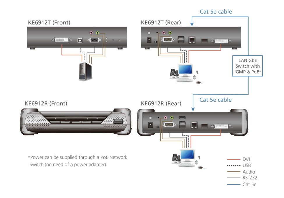 The KE6912 2K DVI-D Dual Link KVM over IP Extender consists of a high performance IP-based transmitter (KE6912T) that connects to the computer and receiver (KE6912R) that provides console access from a separate location. The KE6912 allows access to a computer system from a remote USB console (USB keyboard, USB mouse, DVI monitor) over an intranet, enabling users to locate computers in a secure and temperature controlled environment, which is isolated from users’ workstation.