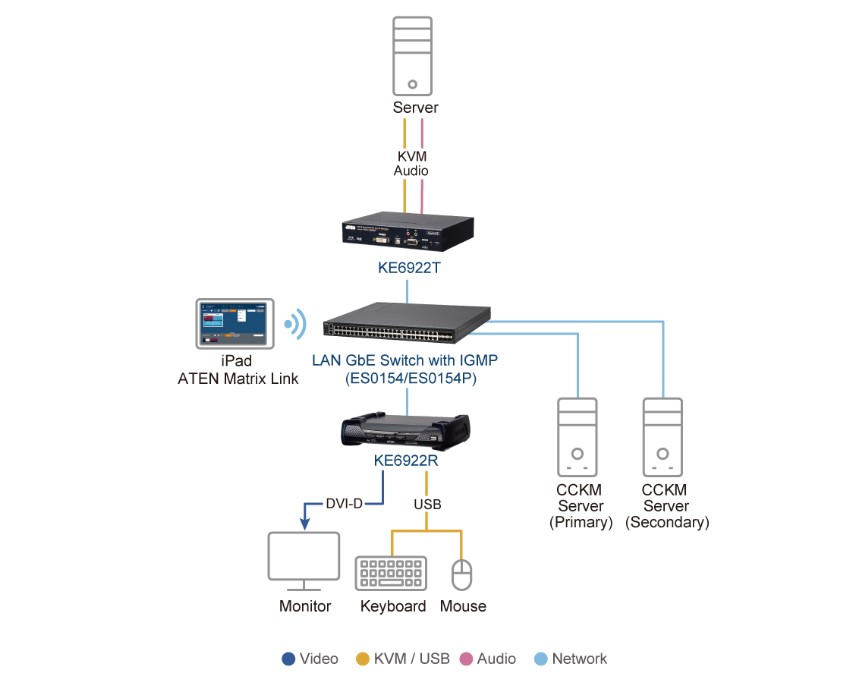 When integrated with the CCKM, the KE6922 supports more advanced features such as authentication lock, connection redundancy, disconnection alert, boundless switching, “Push’ and “Pull’, video wall and multi-display setups, and profile scheduling that provide uninterrupted access with quick and easy control tools to use the KE6922 over a network. More functions include auto detection of all KVM over IP extenders2 in the same subnet for fast installation or configuration, username / password authentication and authorization, and the ability to define different types of connections that can be switched and shared. Security features AES encryption support for secured data transmissions, and RADIUS, LDAP, AD or remote user authentication methods provide an added layer of connection security. Moreover, with an OSD, RS-232 support, and Auto MDIX, the KE6922 is the most cost-effective and convenient way to get a full digital extension from anywhere on the intranet.