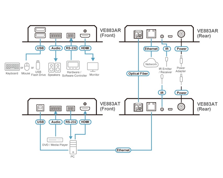 The VE883A is a True 4K HDMI Optical extender that consists of a transmitter VE883AT and a receiver VE883AR to transmit up to 4096 x 2160 / 3840 x 2160 @ 60 Hz (4:4:4) HDMI, audio, USB 2.0, IR, RS-232, and Gigabit Ethernet signals across 300 m (VE883AK1) or 10 km (VE883AK2) over a single duplex fiber optic cable losslessly. While helping avoid bulky cable setup, fiber optic cables are electrically isolated, thus they are immune to RFI and EMI. With ATEN’s exclusive FarSmooth technology, the VE883A prevents lagging and freezing by matching the output rates to the input rates and ensures that the video display is stable, smooth and identical to the source, particularly in long-distance extension applications where uninterrupted video streams are required.