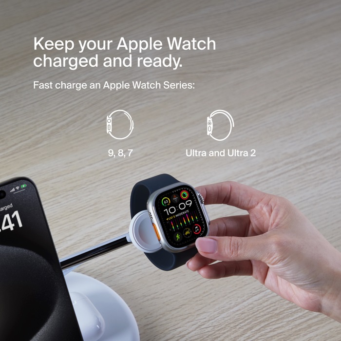Get up to 2x faster wireless charging‡ to your iPhone 16/15/14/13/12, 5W to your Apple Watch and 5W to your AirPods. Leveraging magnetic Qi2 technology, the secure, aligned connection optimizes energy usage and safeguards your device’s battery life.