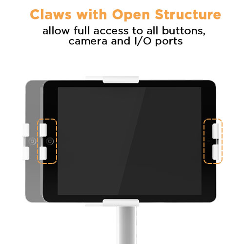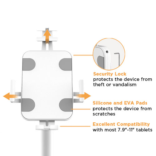 Featuring innovatively designed claws, PAD33-04 is compatible with most 7.9′-11′ tablets, including Apple iPad and Samsung Galaxy Tablet. Both horizontal and vertical view, as well as tilt function, are available in order to provide better customer using experience. Silicone and EVA pads provide all-rounded protection for the precious device. Lockable design with anti-theft screw prevents it from theft and unwanted removal. The internal cable management protects wires and creates a professional look for the tablet kiosk.