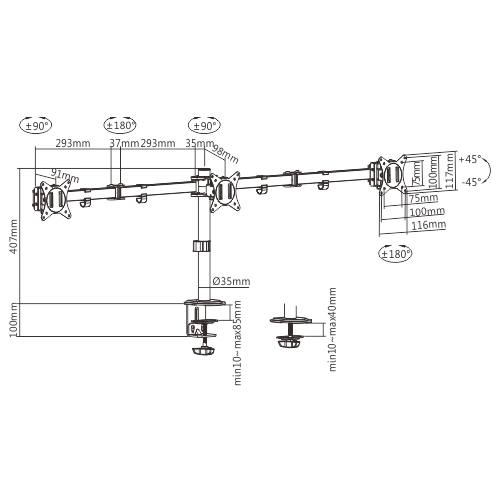 Suggested Desktop Thickness: Clamp:10~85mm Grommet:10~40mm (Clamp:0.39’~3.3′ Grommet:0.39’~1.6′)