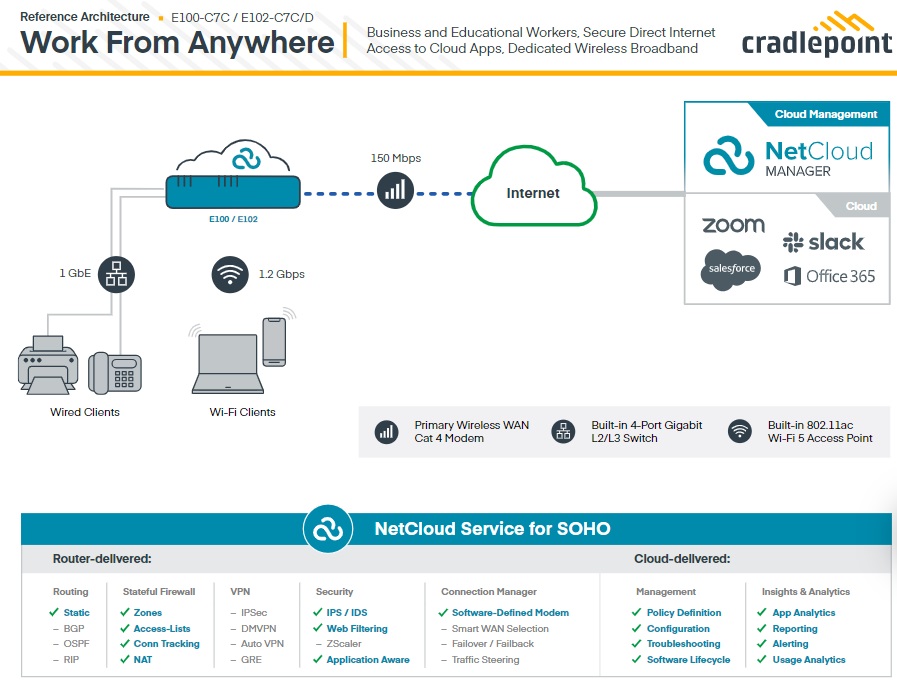 Cradlepoint NetCloud Service for Small Branch provides everything needed to connect the small offices to corporate applications and services from virtually any location. The NetCloud Service includes cloud-based management for optimizing routing, VPN, traffic steering, and security capabilities. The cloud capabilities include defining and applying policies, at-a-glance status insights, reports, troubleshooting, and analytics dashboards. The service includes a warranty for as long as there is an active subscription on the router, online training, live and online support, and all software and firmware updates. Zero-touch deployment features allow pre-configured and pre-activated equipment to arrive on location, so an employee can power up an E100 Series Router, locate the best cellular connection path, and instantly setup the pre-established office parameters through the NetCloud Service, upon auth