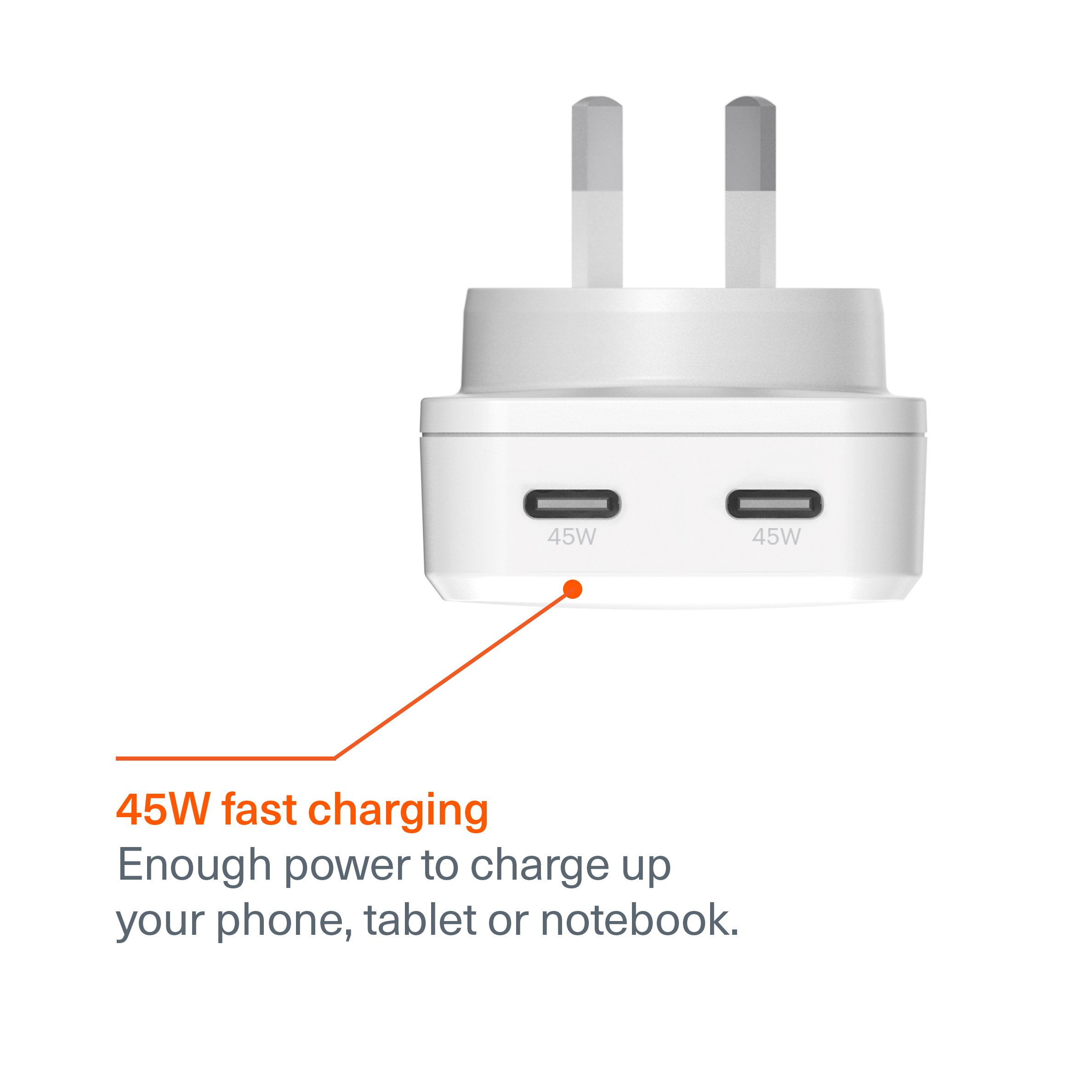 Cygnett ChargePlus 45W Dual Port GaN Slim Wall Charger – White (CY5487PDWCH), 2x USB-C, Portable Lightweight, Charge Two Device At Once, 2 Years | CY5487PDWCH