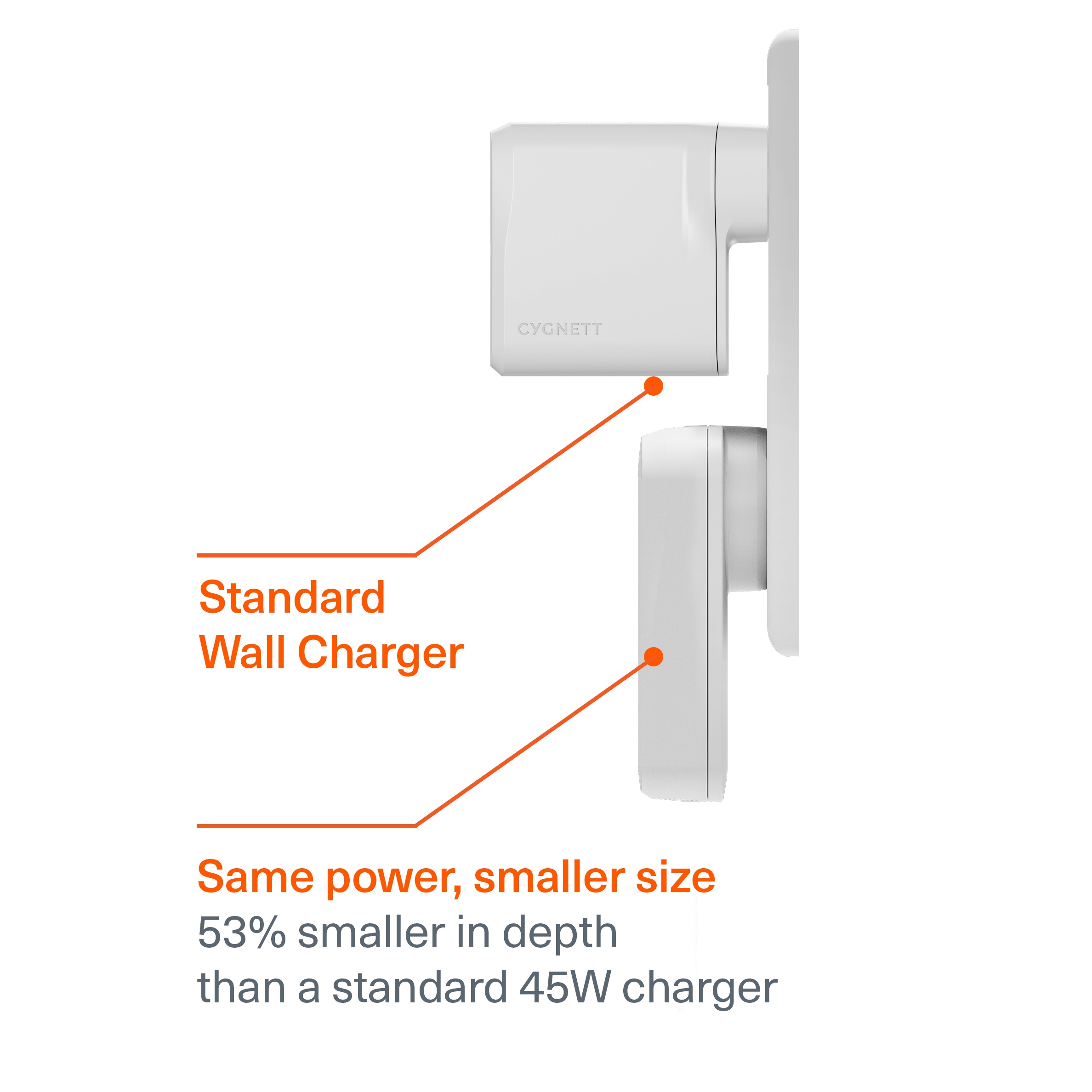 Super-slim size: Charge in even the tightest spaces. With a flush-fit design, this Slim Wall Chargers is 53% smaller in depth than the standard 65W charger, so there’s no corner of your home you can’t power.