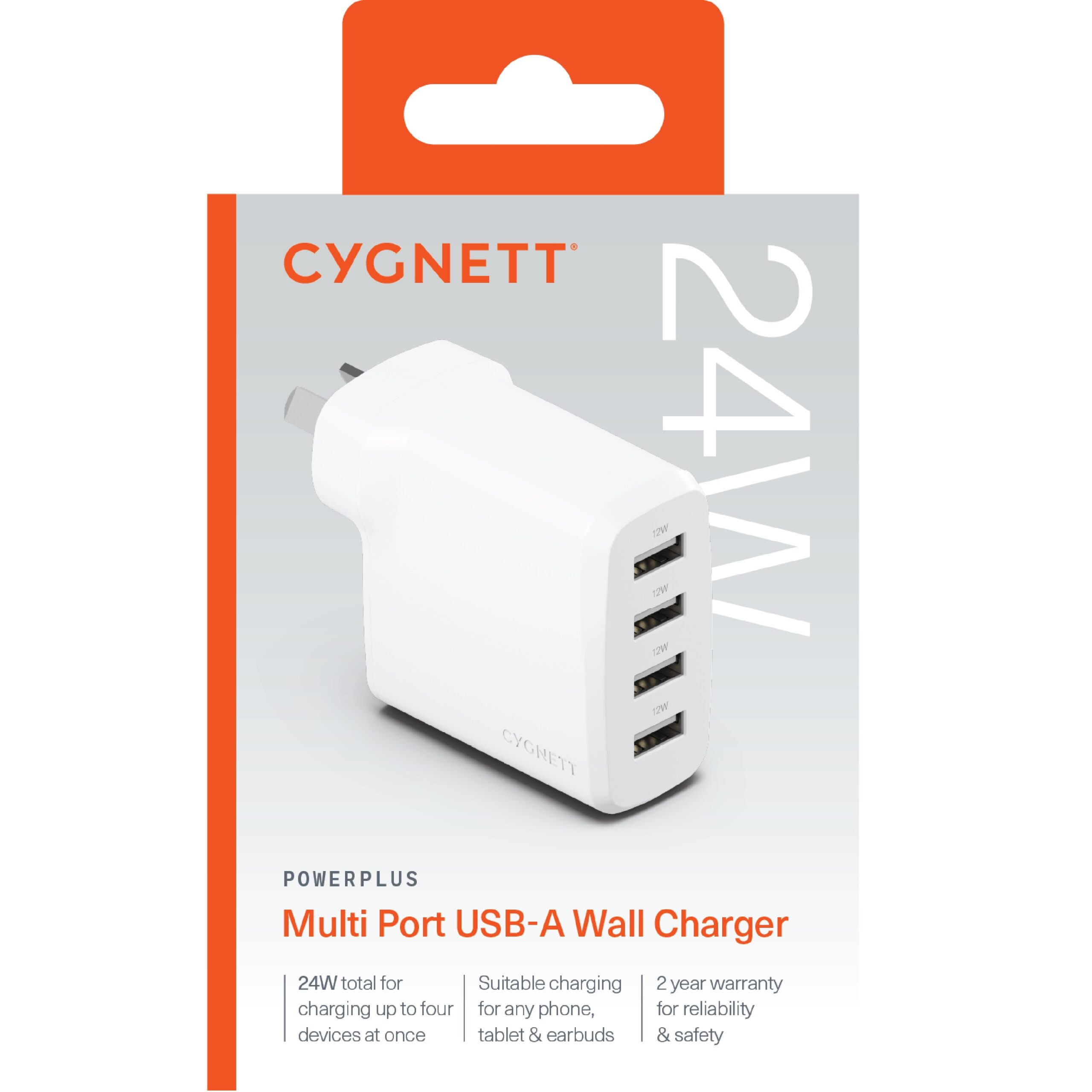 24W suitable charging for all iPhone models. Share the power with 4x USB-A charging ports, allowing you to charge your phone with one USB-A port while accommodating three more devices with the additional USB-A ports. This compact wall charger eliminates the need for multiple chargers and keeping all your small devices powered from one convenient power source. For reliable and safe power sharing, rest assured with our 2-year warranty.