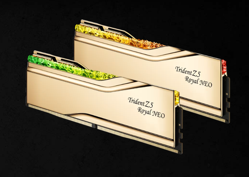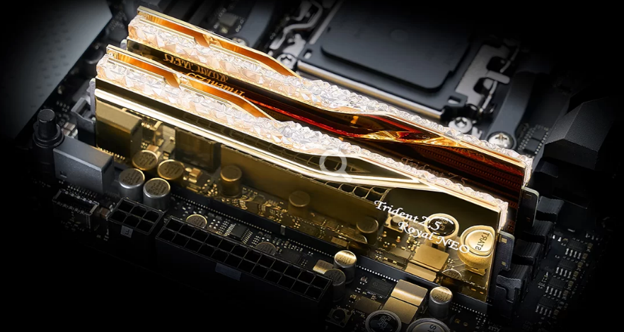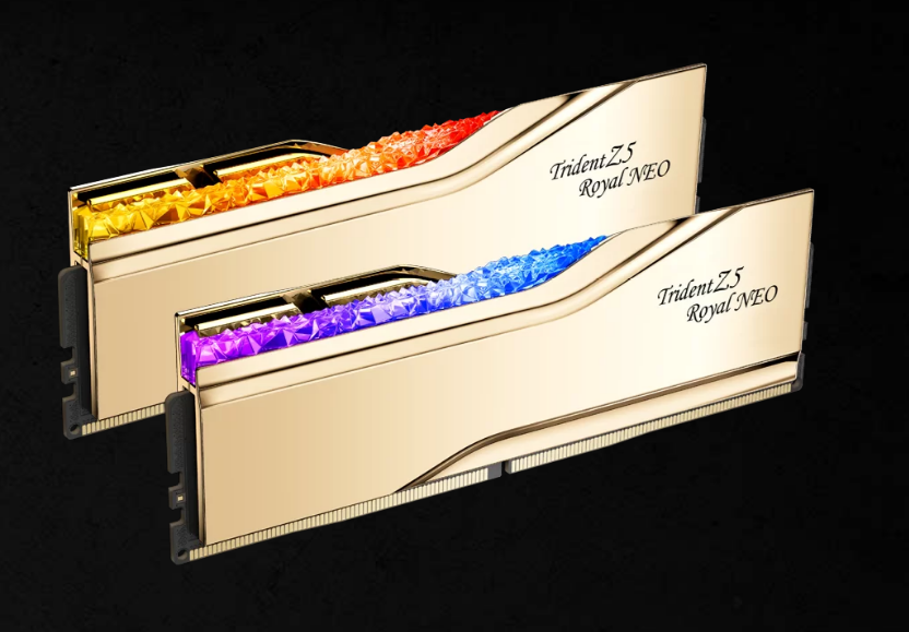 Trident Z5 Royal Neo is the luxury-class of extreme overclock performance DDR5 memory designed for AMD AM5 platforms, featuring a crown jewel design with a crystalline light bar for a magnificent display of customizable RGB lighting and electroplated aluminum heatspreaders with a mirrored finish in gold or silver colors.