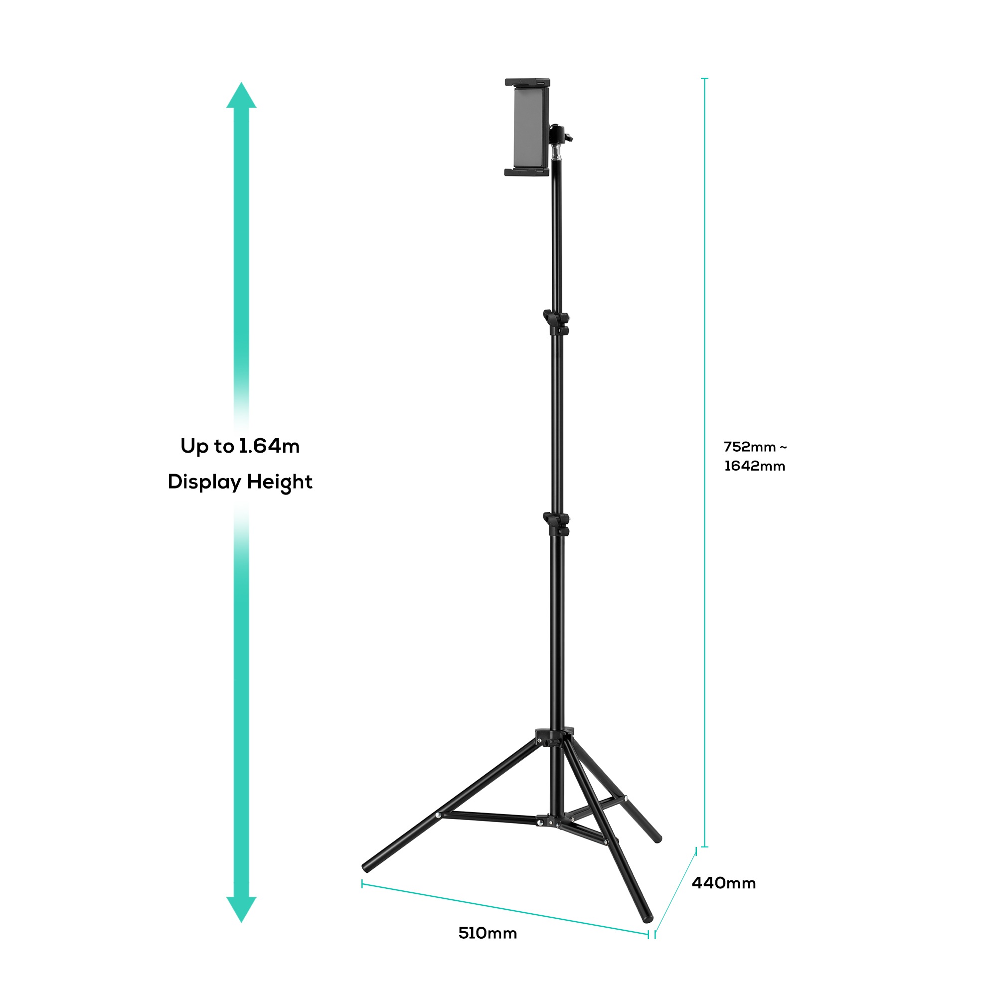 A foldable, lightweight, easy-to-use height-adjustable tripod with integrated tablet/phone holder for viewing your device at a tailored display height, suitable for tablet display, streaming/recording, music note stand, etc.