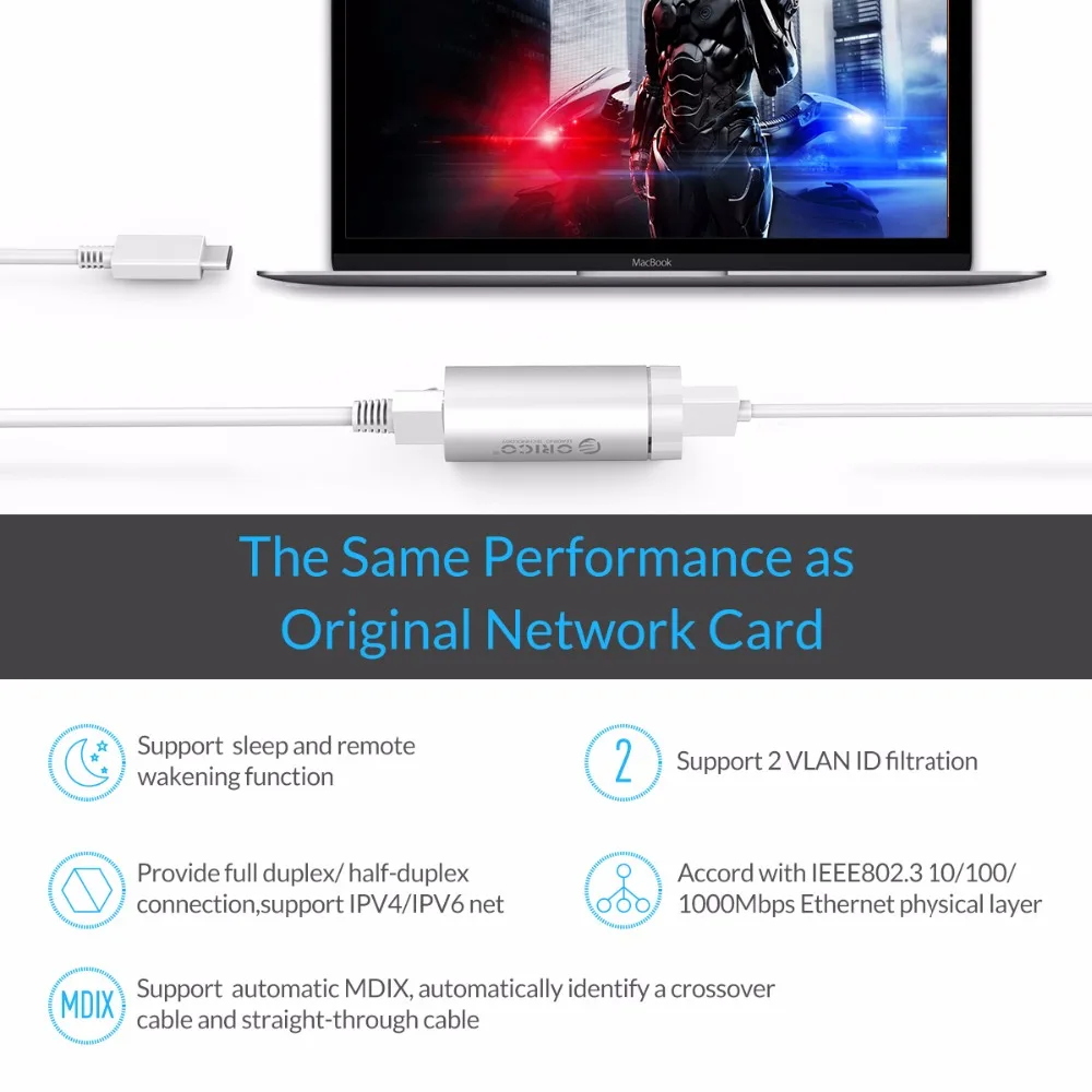 What is in the box: 1 x ORICO USB3.0 to Gigabit Ethernet Adapter, 1 x 1.6Ft. USB Type A to A Data Cable, 1 x 1Ft. USB Type A to C Data Cable, 1 x User Manual, 1 x Service Card