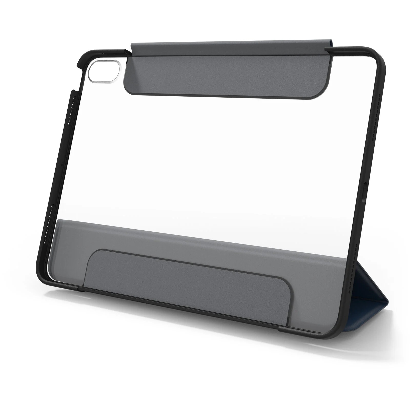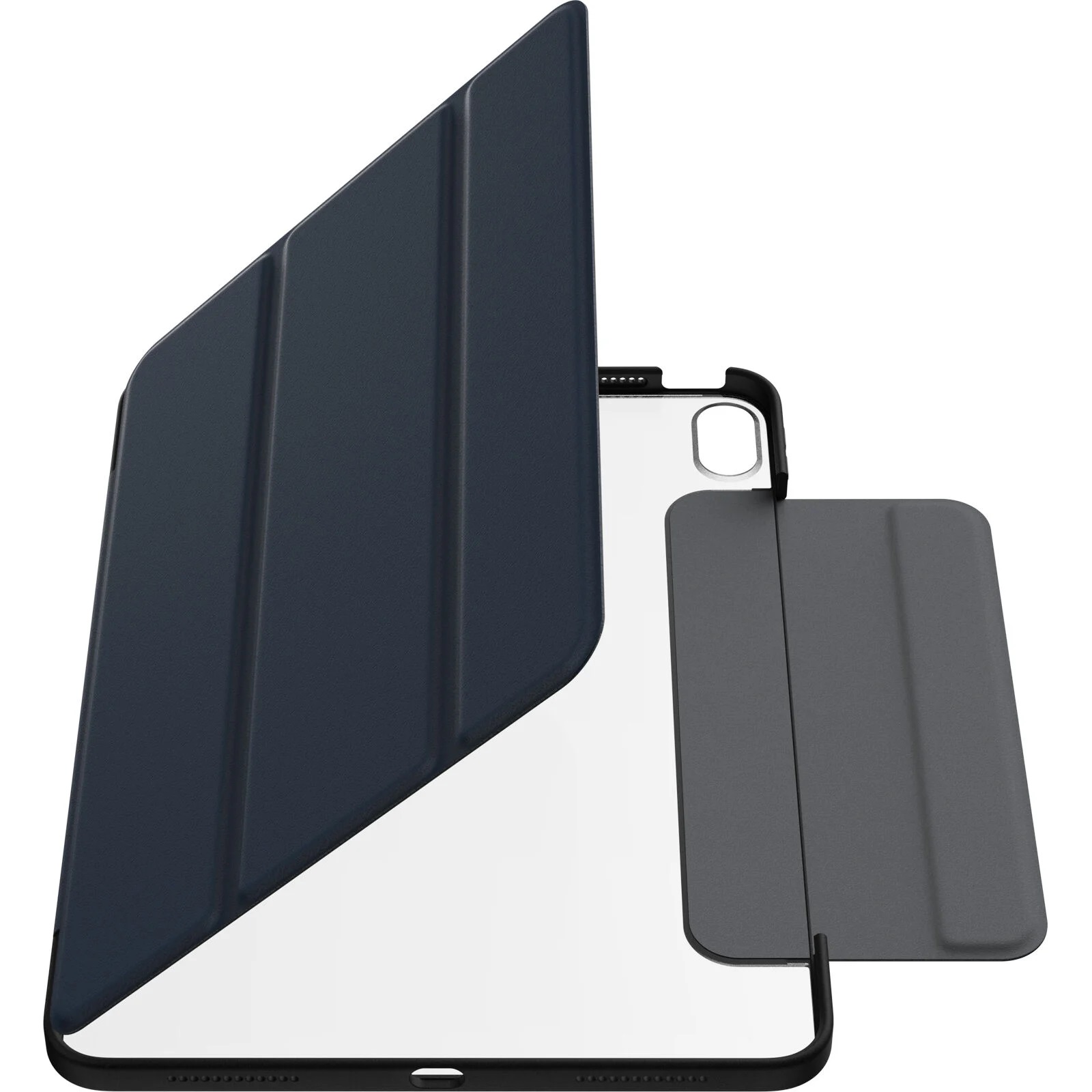 Shown on iPad (10th generation). Clear folio iPad Air 11-inch (M3) and iPad Air 11-inch (M2) case protects against drops and scratches and converts into multiple positions for hands-free typing and viewing. The folio’s microfiber lining guards the screen and holds tight with magnets, which also activate sleep/wake modes for quick-start functionality and battery preservation