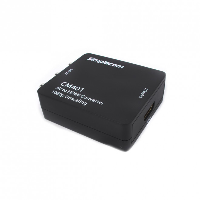 Simplecom CM401 Composite AV to HDMI converter, is a universal converter for analog composite input to HDMI 720p or 1080p (60Hz) output. If you want to use your VCR, camcorder, or game system on your HDTV or HDMI monitor, simply plug standard composite AV cables (yellow, red, and white) into the input port of the converter, and then connect an HDMI cable from the converter to your TV. It works great with either 720p or 1080p TVs, and the output mode is easily selectable with a switch on the device. This converter’s advanced processing allowing you to get the clearest picture quality possible with optimal colour and detail reproduction. Both video and audio are integrated into the HDMI output, providing an all-digital signal to maximize the fidelity of the audio and video.
