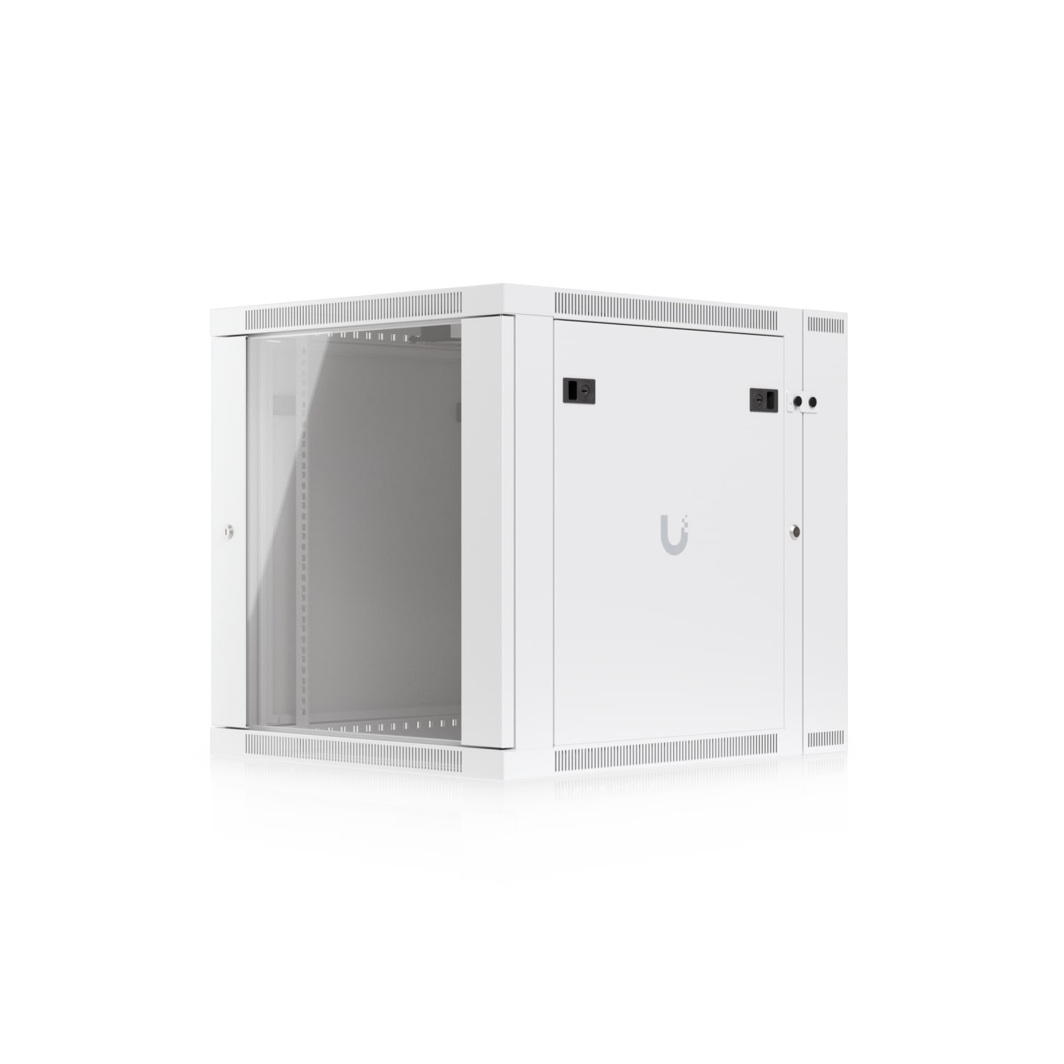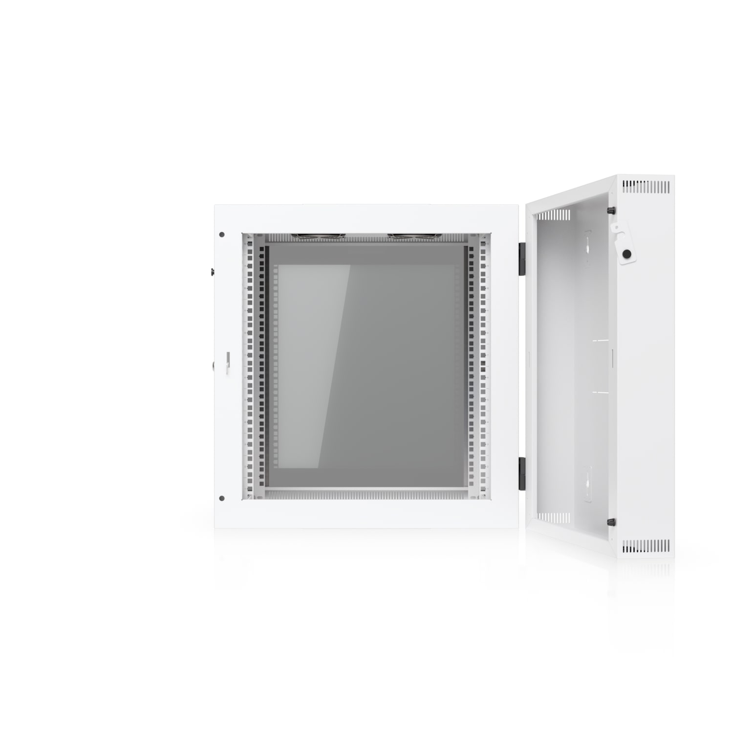 Fully assembled wall-mount rack with built-in fans and removable panels, engineered for easy equipment access and space-efficient small-scale deployments.