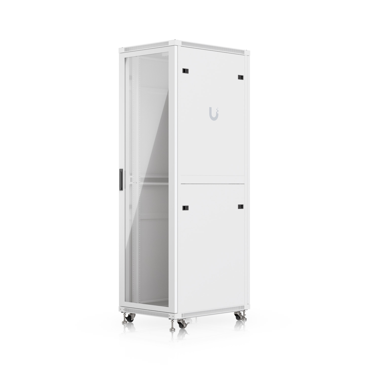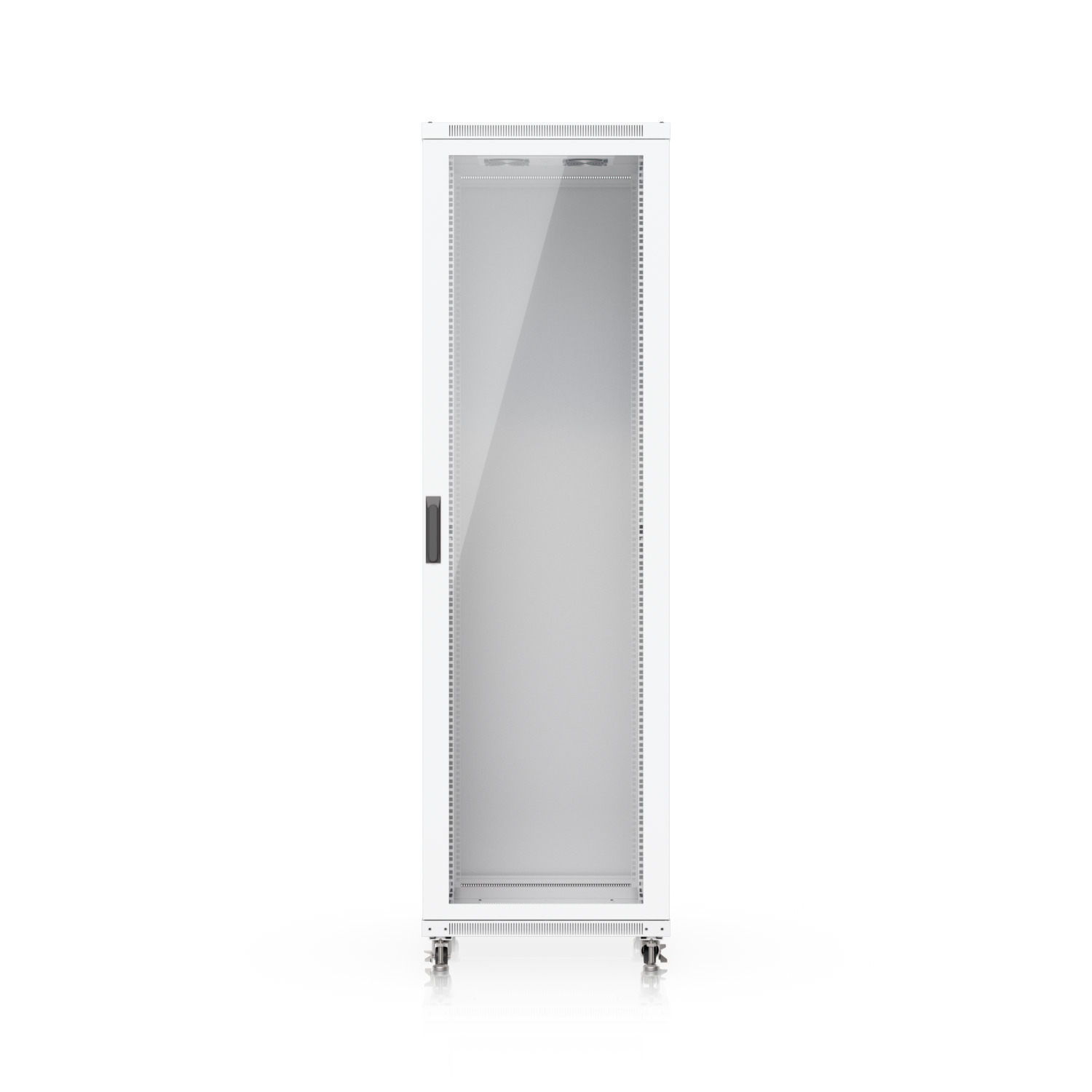 Fully assembled floor rack with built-in fans, removable panels, and lockable casters, engineered for optimal airflow, heavy-duty stability, and easy equipment access.