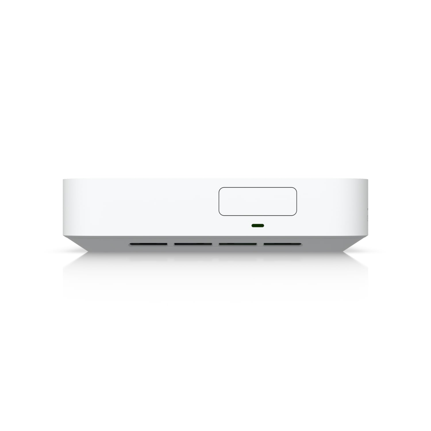 Compact 2.5G Cloud Gateway with 30+ UniFi device / 300+ client support, 1.5 Gbps IPS routing, and selectable NVR storage.