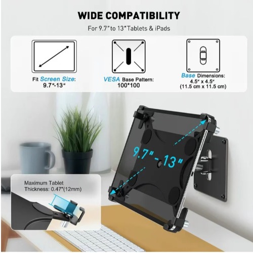 UNIVERSAL DEVICE COMPATIBILITY: One mount for all your needs. Our Universal tablet wall mount is expertly designed to hold any device with a screen size between 9.7′ and 13′, including all models of iPad Pro, Air, and Galaxy Tab. This versatile wall mount tablet holder adjusts to fit tablets up to 0.47 inches (12mm) in thickness, making it a truly future-proof solution for your business..