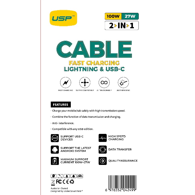 USP Braided 2-in-1 USB-C to Lighting (27W) + USB-C (100W) Super Fast Charging Cable (1.2M) Black